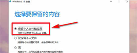 5.接下来出现【选择要保留的内容】,小编建议选择第一项,保留个人文件和应用,也便于后期回退到win10系统。不过大家根据自己的情况选择即可。