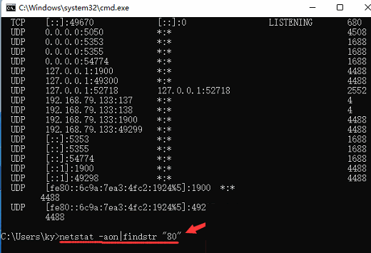 4、最后,在底部输入netstat-aon|findstr“端口号”命名,即可查找指定端口信息。