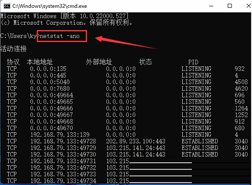 3、接着,输入netstat-ano打开网络活动连接列表。