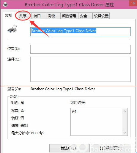 4、点击进入对应的打印机属性对话框,点击共享选项卡,如下图所示。
