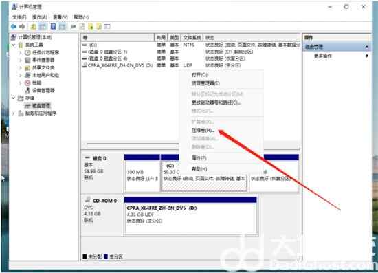 3、然后用鼠标右键选择要分区的磁盘c盘,选择压缩卷打开。