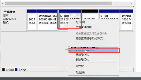 4、右键点击D磁盘(如下图),点击窗口中的扩展卷。