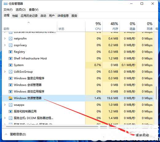 3、任务管理器窗口,选择Windows 资源管理器进程,点击右下角的重新启动,即可重启Windows 资源管理器,这其实是Windows 资源管理器进程explorer.exe结束后,又重新启动的过程。