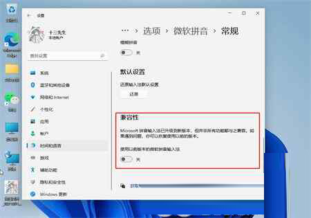 6、最后,滑动开关将兼容性(Microsoft 拼音输入法已经升级到新版本,但并非所有功能都与之兼容。如果遇到问题,你可以恢复使用以前的版本)选项打开。