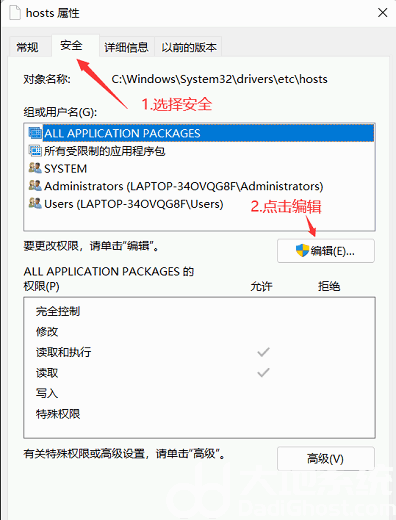4、切换到【安全】选项卡,然后点击【编辑】;