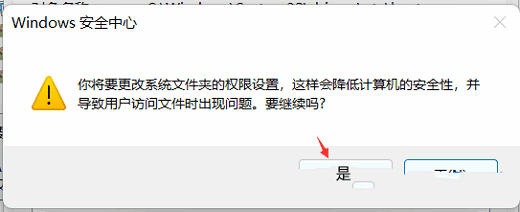 7、Windows 安全中心提示,你将要更改系统文件夹的权限设置,这样会降低计算机的安全性,并导致用户访问文件时出现问题。要继续吗?点击【是】;