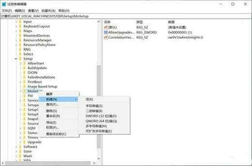 3.右键单击MoSetup文件夹,选择新建DWORD(32位)值选项。