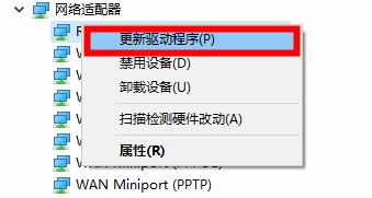2、找到“网络适配器”并单击下拉符号,找到你的网卡驱动,右键选择“更新驱动程序软件”;