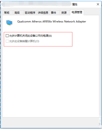 4、在打开的电源管理窗口中,把【允许计算机关闭此设备以节约电源】前的复选框的勾选去掉。