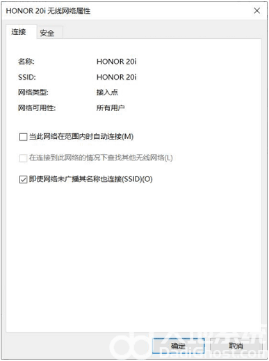 8、最后在无线属性设置中,将「即使网络未广播其名称也连接」前面的√打开,并点击底部的「确定」保存即可。