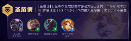 羁绊效果:圣盾使释放技能时,获得相当于最大生命值15%(2),35%(4)的护盾