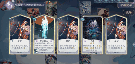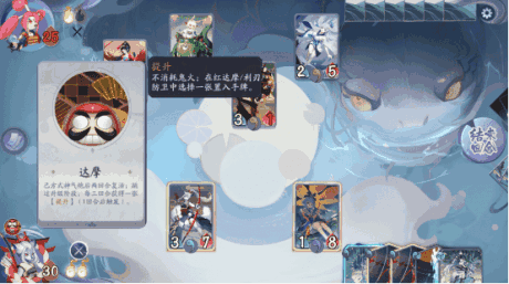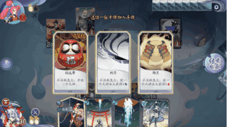 “红达摩”——不消耗“鬼火”升级一个式神;“利刃”——不消耗“鬼火”使一个式神永久获得+2力量;“防卫”——不消耗“鬼火”使一个式神永久获得+2生命。对局中我们要在不同的时机选择合适的卡牌来提升我们式神的战斗力。