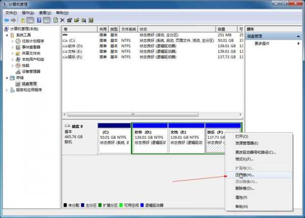 首先,右键计算机图标----管理----磁盘管理,在一个分区较大的磁盘右键添加一个压缩卷。