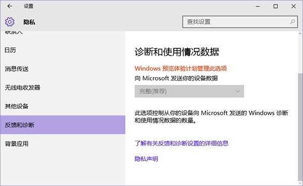 微软要求参与预览版计划的用户,需向微软发送完整的诊断和使用情况数据。升级预览版后,该选项将自动设置为“完整”,且不可更改。如下图所示: