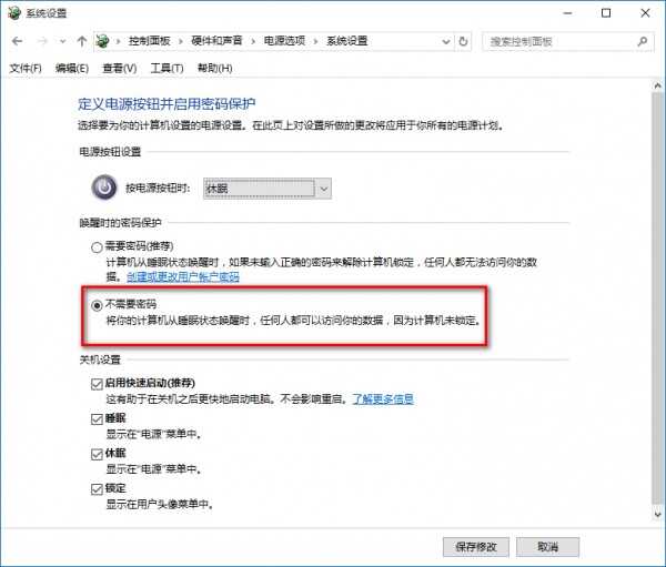 勾选下方的不需要密码,点击保存修改按钮,如下图所示