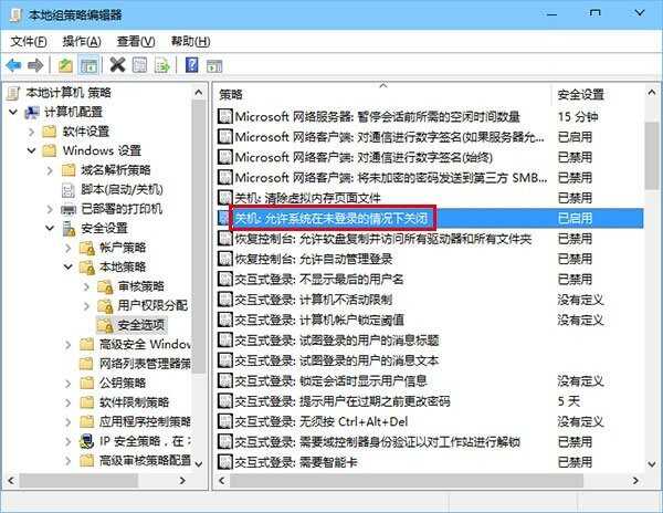 2、在左侧目录找到计算机配置→Windows设置→安全设置→本地策略→安全选项,然后在右侧项目中找到“关机:允许系统在未登录的情况下关闭”,如下图——