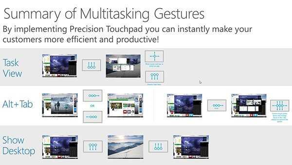 在Win10中的触控板手势共有三大类,分别为任务视图、Alt+Tab组合键以及显示桌面,均为多指组合配合使用。具体方法如下图: