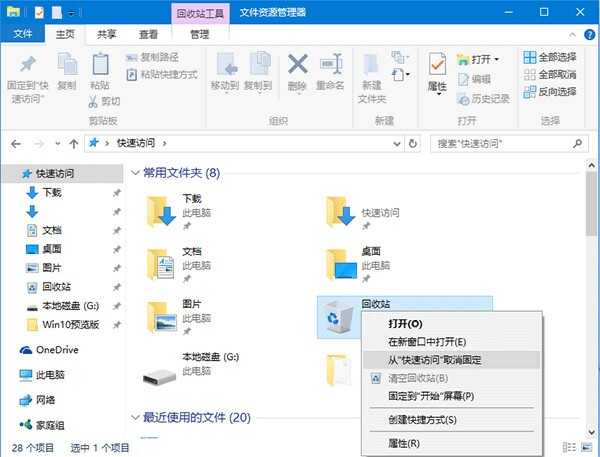 此时可以看到回收站已经出现在了“快速访问”中。如果想恢复默认状态,只需在“快速访问”中的回收站图标上点击右键,选择“从‘快速访问’取消固定”即可。