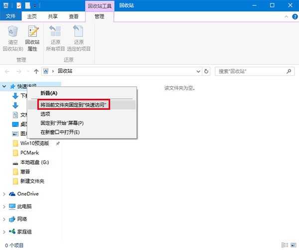 Win10的“快速访问”功能可以为用户提供近期常用的位置,免去用户搜寻的麻烦,点击之后可以直接进入。在Windows10文件资源管理器左边导航栏中,没有了回收站的位置,因此用户如果想使用这种方式查看回收站并不是很方便。因此有些用户就想到把回收站固定到“快速访问”。不过“回收站”这个文件夹比较特殊,系统默认并没有提供“固定到快速访问”的选项,而其他文件夹都有这个待遇。