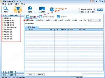1、在星光高清视频下载器的左侧栏,有电影连续剧排行榜、音乐游戏排行榜、综艺体育排行榜,包括其下的分类排行榜。每个排行榜都是来自各大搜索引擎的Top50,成为了流行的风向标,比如电影排行榜中是用户搜索量最大的50部电影。2、在每部片子的片名右侧都有视频搜索、视频图片、视频信息的图标,直接点击各按钮即可获得相关内容。变形金刚是最近热播的大片,因为其大量的搜索量而荣登榜首,点击搜索视频按钮,即可快速获得各大视频网站的搜索结果。