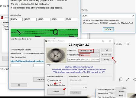 4、打开CB-Keygen.exe。 在列表中选择ChessBase 15。 单击新建序列。 Seclect Engine:无。