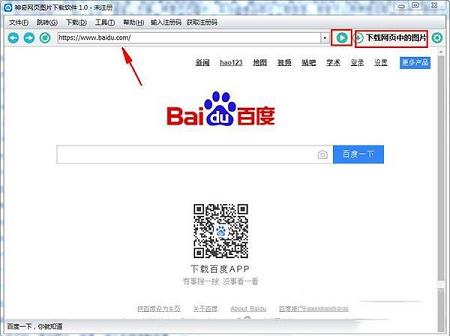 1、打开软件,输入你想要下载的图片所属的网站地址,以百度首页为例,如图所示,点击蓝色的打开图标打开该网页,点击下载网页中的图片。