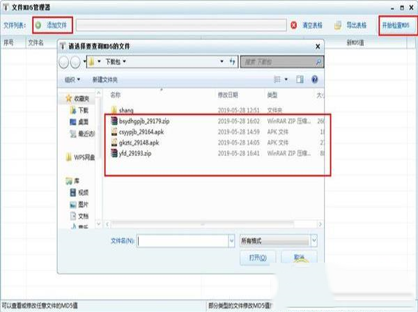 1、点击首页面文件MD5管理器,点击添加文件,选择文件打开