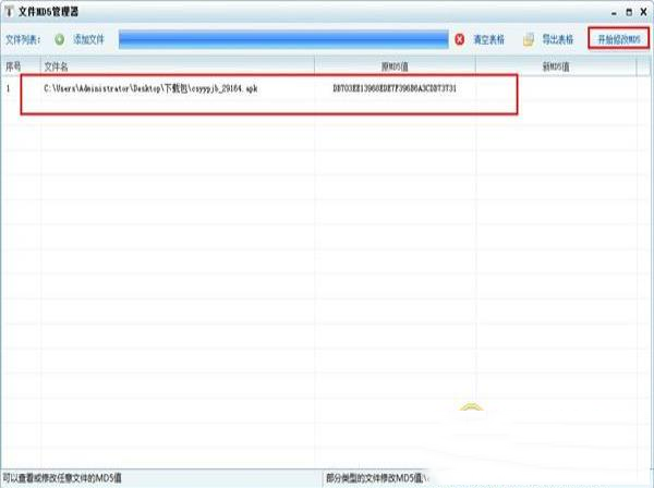 2、打开之后点击右上角的开始检查MD5,会出现如下图所示,在此点击右上角的按钮会变成开始修改MD5(注意:部分类型的文件修改MD5值后,可能会导致文件损坏,所以修改之前,最好备份一下)