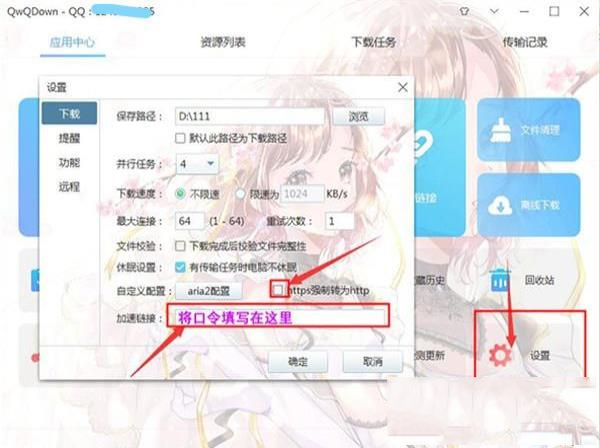 重启软件,打开设置,将口令填写在加速链接里,再开始下载。