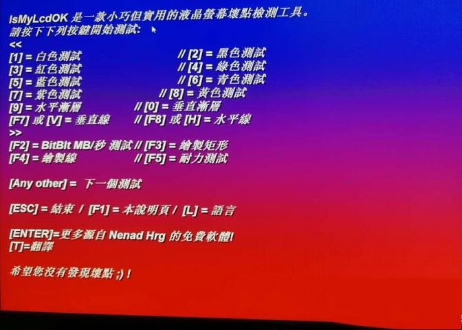 今天小编要给大家介绍一款液晶显示器测试软件是一个检测液晶显示器是否存在坏点的小程序,能够通过一系列标准测试验证LCD显示器是否有死像素或卡住像素,只有几十kb大小、无需安装直接运行、也不需要其它运行环境,使用方法也特别简单,按数字键盘0-9即可执行检测,或者按任意键依次进行检测也可以,它很容易处理,即使是对计算机软件经验很少或没有经验的用户也是如此,按F1回到菜单,按ESC退出程序,真的非常简单,由于不需要安装,您只需将可执行文件放在硬盘上的任何位置,然后单击它即可运行,也可以将IsMyLcdOK中文版保存到USB闪存驱动器或类似设备,以便毫不费力地在任何机器上使用它,界面基于全屏窗口,其中列出了主要选项。您可以执行白色,红色,蓝色或紫色测试,水平渐变,垂直线条,绘画线条,黑色,绿色,青色或黄色测试等,您可以选择这些选项中的任何一个,也可以通过空格键导航来完成所有这些选项,从现在开始,您必须依靠自己的观察技能来检测任何有问题的像素,如果没有发现任何信息,则表示您的LCD显示器没有任何像素问题。。