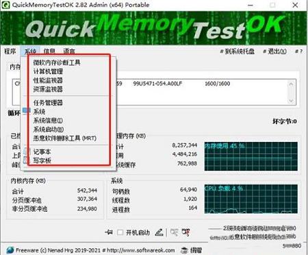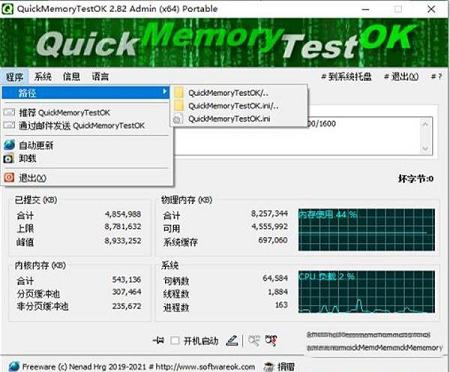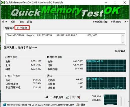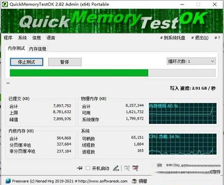 QuickMemoryTestOK是一款简单易用的内存测试工具。该软件可以帮助您分析当前内存设备是否有缺陷,内存参数是否与业务描述的相同,如存储容量、负载、速度等参数,还可以了解CPU的使用情况。可以快速检测RAM中的错误,以避免用户遇到意外问题。在高内存中测试windows的行为将导致其他系统错误。它可以一键快速启动测试并显示详细信息。使用简单友好。如果您的计算机根本无法启动或随机重新启动,很可能会遇到内存问题。如果分析显示有错误,则表示您的存储设备有问题,需要及时与商家交换。现在网上销售的一些内存设备有缺陷。如果您购买了新的存储设备,可以提供此软件进行预测试,以便及时了解当前设备的参数和性能。本次小编为大家带来的是QuickMemoryTestOK中文绿色版,该软件无需安装,双击打开,直接下载本站解压包,打开即可享受,使用更方便,下面还提供了详细的使用方法,感兴趣的小伙伴们千万不要错过了,快来本站下载体验吧。