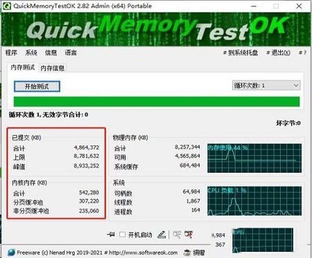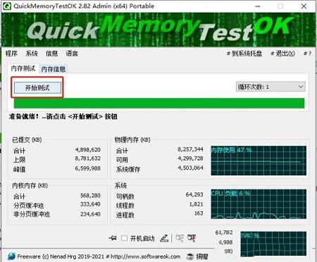 1、QuickMemoryTestOK绿色版提供简单的测试方案,打开软件点击开始测试就可以分析2、分析结果显示在软件界面,可以查看内核内存(KB)、物理内存(KB)以及Commit Charge