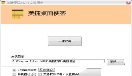 1、双击打开应用程序打开美捷便签安装向导,单击【浏览】选择软件安装位置,确定后单击【一键安装】