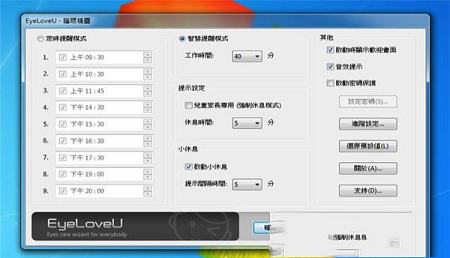 EyeLoveU是一款非常实用的免费眼睛保护软件,可以说是专门为电脑族所设计的护眼程式,适合长期使用电脑的人,可以在使用电脑一段时间后提醒你该让眼睛休息。在电脑前久坐的人,不可避免的身体就会出现一系列问题,眼睛酸痛、流泪,同时也因为久坐导致了颈椎和腰部的疼痛,真的是非常得不偿失;对此,今天特地带来了这么一款软件,它能够定时提醒你注意护眼,除了具备中文介面,功能也是最完整的,主要分为两种提醒模式:定时提醒、智慧提醒,前者可设定不同的提醒时间,后者为工作持续几分钟后进入休息模式。可自定义进行定时提醒,以及智慧提醒模式,智慧提醒是根据你的鼠标和键盘的操作动作来只能判断使用时间,而且只要你的离开电脑停止工作超过五分钟,它就会自动将计时归零 ,内建的人工智慧逻辑,还可以处理模糊的操作计时,并且依据不同的时段,而有不同的提醒画面。除此之外,如果家长想让小孩不过度沉迷于电脑前,可以开启「儿童家长专用」选项设定,强制在时间限制一到锁定萤幕,还能设定密码保护防止EyeLoveU被关闭。