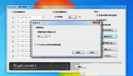 从「进阶设定」里可以调整提醒视窗的覆盖面积比例,预设70%,这是为了在提醒模式下依然可以处理一些工作,例如储存或暂时关闭某个城市;因为提醒是很柔性的,可以点选下方按钮将它关闭,若想要更硬性规定自己休息,勾选「不允许停止或暂停护眼精灵」达到强制让自己休息的效果。