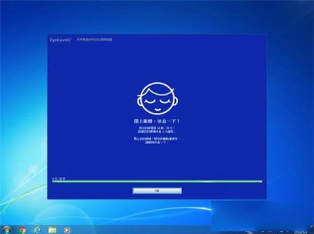 4、下面就是EyeLoveU 在预设的遮蔽70% 范围下跳出来的提醒效果,可以看到每次的文字和颜色都不太一样,下方很贴心地设计了一条进度列,让你知道应该还得休息多长时间。如果你想提前结束休息提醒,亦能点选下方按钮来确认关闭。