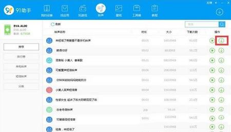 第一步:打开91助手PC端,将移动设备连接到电脑,选择“铃声”模块中,点击铃声列表右边的“下载”按钮,下载该铃声并导入到移动设备中。