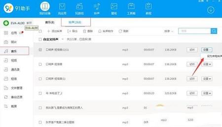 如何设置铃声第一步:打开91助手PC端,将移动设备连接到电脑,选择“铃声”模块中,点击铃声列表右边的“下载”按钮,下载该铃声并导入到移动设备中。