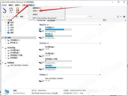 6、进入软件后点击帮助在弹出的窗口点击注册。
