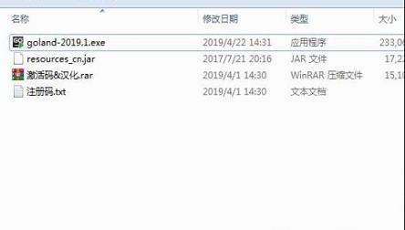 1、下载解压,得到goland 2019.1原程序、中文补丁包和注册码;