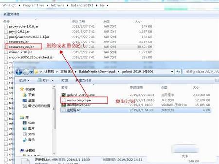 11、如果想汉化成中文,可以将软件包中汉化文件resources_cn.jar复制替换。打开安装目录下的“lib”文件夹,将原来的resources_en.jar英文版文件删除或重命名,再将goland 2019汉化包“resources_cn.jar”复制入内即可,默认安装路径【C:\Program Files\JetBrains\GoLand 2019.1\lib】resources_en.jar重命名是为了返回英文界面,因为有用户说汉化不是很全面,但99%汉化好了。