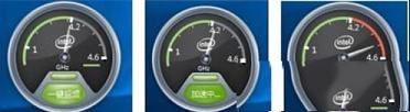 1、一键超频器会显示未超频时的表盘界面,频率指针表示CPU的实时频率并动态摆动。绿色部分代表该CPU的默认频率范围,灰色部分代表超频后该CPU可到达的新增频率范围。