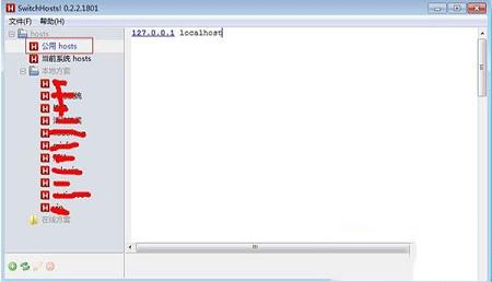 主界面如下图,有一个公共的hosts标签页,你可以在这个里面把公用的hosts写进去,这样其他标签生效的时候会加载这个共用的。点击红框处就生效了。