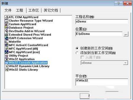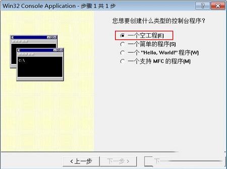 切换到“工程”选项卡,选择“Win32 Console Application”,填写工程名称和路径,点击“确定”,会弹出一个对话框询问类型,这里选择“一个空工程”,如下图所示: