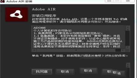 1、下载软件包解压,双击“AdobeAIRInstaller.exe”程序进入安装界面,点击我同意。
