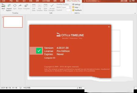 Office Timeline是一款功能强大的PowerPoint时间轴分局插件,它是一个非常好用的轻量级PowerPoint加载项,可以通过简单的操作就快速完成时间轴的制作和管理,并且制作出来的效果也会非常的美观,除此之外,还可制作甘特图、Swimlane幻灯片等,最多包含10个里程碑和任务。安装完成后使用的时间轴的方法只需要打开Microsoft PowerPoint,然后单击Office时间轴功能区就能够开始自由的制作啦,非常方便,软件拥有非常多的时间轴模块给大家选择,可以在制作PPT模块的时间随时的插入时间轴模块使用,并且ppt时间轴插件(Office Timeline)给用户提供了许多自定义的颜色,形状、日期类型等参数,使用本机的PowerPoint对象,还可以共享其他PowerPoint幻灯片和图像等!当然你也可以直接集成到PowerPoint中,提供丰富的PPT时间轴模板,您可以直接使用这些模板,也可以在这些模板的基础上进行修改和设计。本次小编为大家带来的是Office Timeline破解版,内附破解补丁可完美破解软件,需要的朋友可以下载体验一下。
