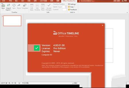 office timeline是一款功能非常强大实用的PPT时间轴制作插件工具。这款软件的功能非常的实用,它支持帮助用户创建可视项目先和甘特图。这款软件可直接作为插件集成到Microsoft PowerPoint中,帮助用户使用PPT时为用户的观众创建可自定义的项目视觉效果,可以让PPT看上去变得更加的直观,用户也能修改时间轴模板上的内容,可以让用户看上去变得更加的容易理解且直观,能看到每一时间点所发生的事情哦。此外,软件还为用户提供了丰富的自定义的颜色、形状、日期类等等各种参数,非常的丰富哦。而且使用本机的PPT对象还能共享其他PPT幻灯片和图像等等。此外,软件还有协同工作、制作时间线、成精美的甘特图、显示项目等等各种功能。本次小编带来的是office timeline免费版,下文富有详细的图文破解过程,喜欢这款软件的用户赶紧来本站下载体验吧。