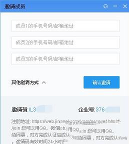 2、在弹出框中填入同事的信息后点击确认邀请,也可以通过把邀请码和企业号发给同事进行邀请