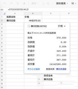 STOCK股票函数可以通过股票代码从互联网中直接调用股票信息(价格、价格、涨跌额、涨跌幅、开盘价、最高价、最低价、成交量、实时价格)。