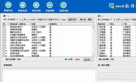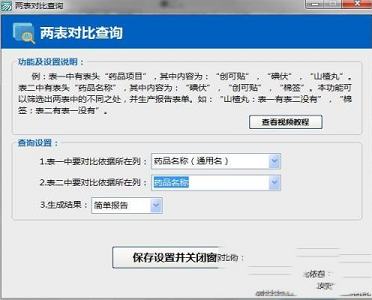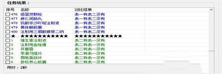 举例: 表一中有表头“药品项目”,其中内容为:“创可贴”,“碘伏”,“山楂丸”。表二中有表头“药品名称”,其中内容为:“碘伏”,“创可贴”,“棉签”。本功能可以筛选出两表中的不同之处,并生产报告表单。如:“山楂丸:表一有表二没有”,“棉签:表二有表一没有”